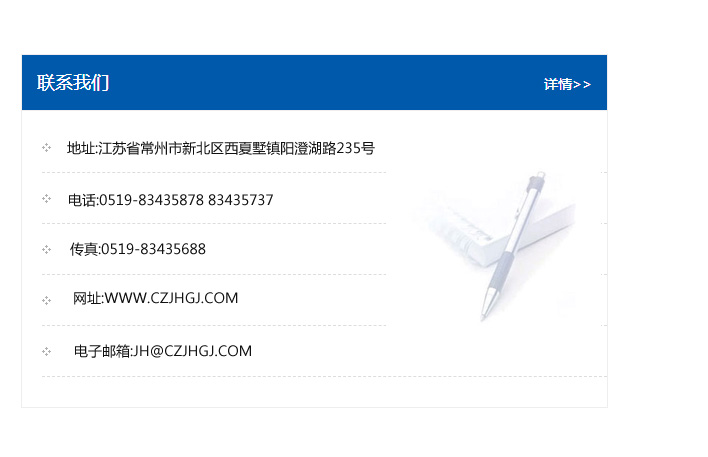 地址:常州市新北區友邦商務大廈1幢16、17層  電話:0519-85101652  傳真:0519-85112595  郵編:213022  網址:www.cz-jiayue_cn.rcsjgzyz.com  郵箱:xiajifengaa@163.com